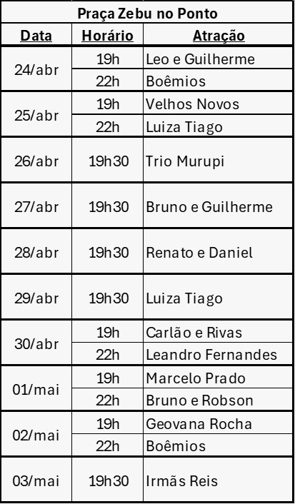 A 91ª ExpoZebu conta com uma agenda extensa de shows regionais gratuitos para quem passar pelo Parque Fernando Costa, em Uberaba (MG), até o dia 3 de maio. As atrações são distribuídas nas três praças de alimentação do recinto e se estendem por todos os dias da programação.