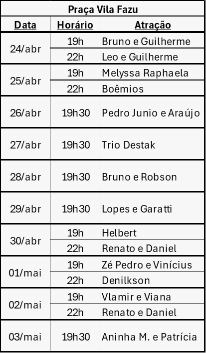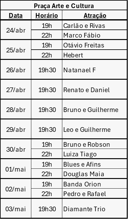 Confira abaixo as atrações, bem como as datas, horários e locais dos shows: